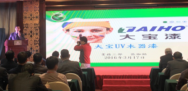 隨后,大寶漆經銷事業部高顯峰課長、張珈銘專員、胡平平課長、鄧偉利專員分別對“三三專案”歐式涂裝、UV木器漆、水性木器漆及寶宮石相關產品內容向大會作報告,其中胡平平課長所作“漆時代‘水’做主”的主題演講成為本次研討會的重點與亮點內容。