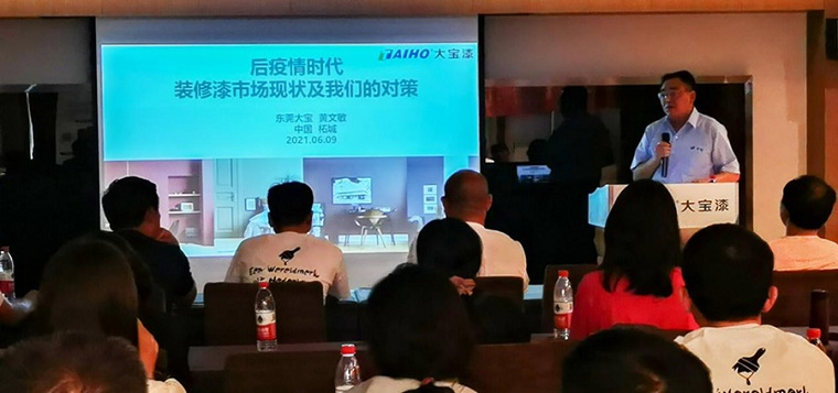 隨后由業(yè)三部東北區(qū)域業(yè)務(wù)課長黃河玉向經(jīng)銷商系統(tǒng)而專業(yè)地介紹了近期公司上市的各渠道新產(chǎn)品。從零售渠道新推出的大寶抗病毒全效墻面漆、零純+植物抗菌墻面漆,到專業(yè)領(lǐng)域的絲絨蛋殼光產(chǎn)品、陽臺廚衛(wèi)專用漆、工業(yè)風(fēng)裝修所需的炫黑涂料;從工程渠道的仿石漆產(chǎn)品、地坪漆到工程領(lǐng)域新關(guān)注的無機涂料產(chǎn)品系列、大健康產(chǎn)品系列再到工業(yè)領(lǐng)域的輕防腐系列產(chǎn)品;從家裝市場輔助材料的防水、墻地固、瓷磚背膠系列到工程翻新和維修渠道的滲透型界面劑、大寶液體卷材等,黃課長結(jié)合每種產(chǎn)品的上市背景、物性介紹、產(chǎn)品認證和檢驗報告等內(nèi)容向經(jīng)銷商推介每種產(chǎn)品的市場推廣方向、市場銷售機會及施工注意事項。
