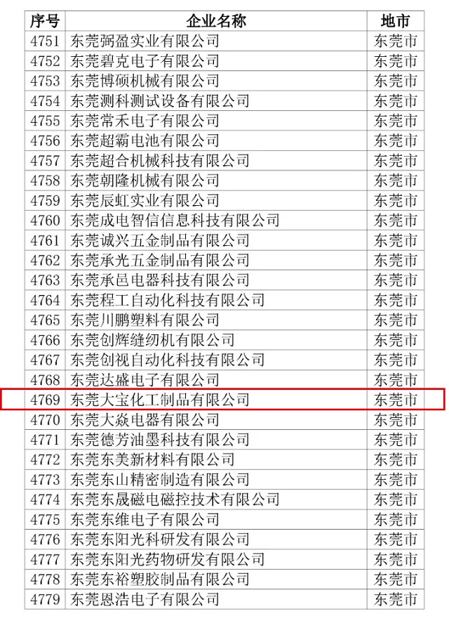 12月11日,公示的廣東省2017年第二批擬認定國家高新技術(shù)企業(yè)名單,東莞大寶化工再次通過“高新技術(shù)企業(yè)”認定,是繼2011年被認定為高新技術(shù)企業(yè)后第三次通過認定。它不僅標志著大寶化工的研發(fā)創(chuàng)新工作邁上新的臺階,也表明大寶化工的自主研發(fā)能力和創(chuàng)新能力均在涂料行業(yè)中處于前列!
