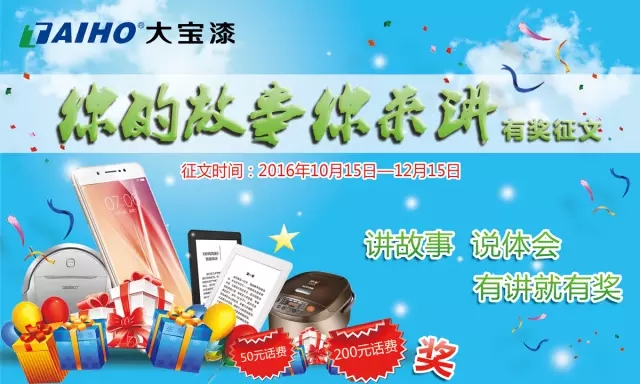 為更好地促進(jìn)大寶漆各經(jīng)銷商同仁間的交流與互助,讓經(jīng)銷商同仁分享成功的經(jīng)驗(yàn),通過分享市場(chǎng)第一線員工的成功案例及心得體驗(yàn),并以此作為學(xué)習(xí)楷模,取其智慧精華,促使各地經(jīng)銷商同仁互補(bǔ)優(yōu)勢(shì)、共同提升,故大寶漆官方微信和大寶報(bào)聯(lián)合主辦“你的故事你來講”有獎(jiǎng)?wù)魑幕顒?dòng)。